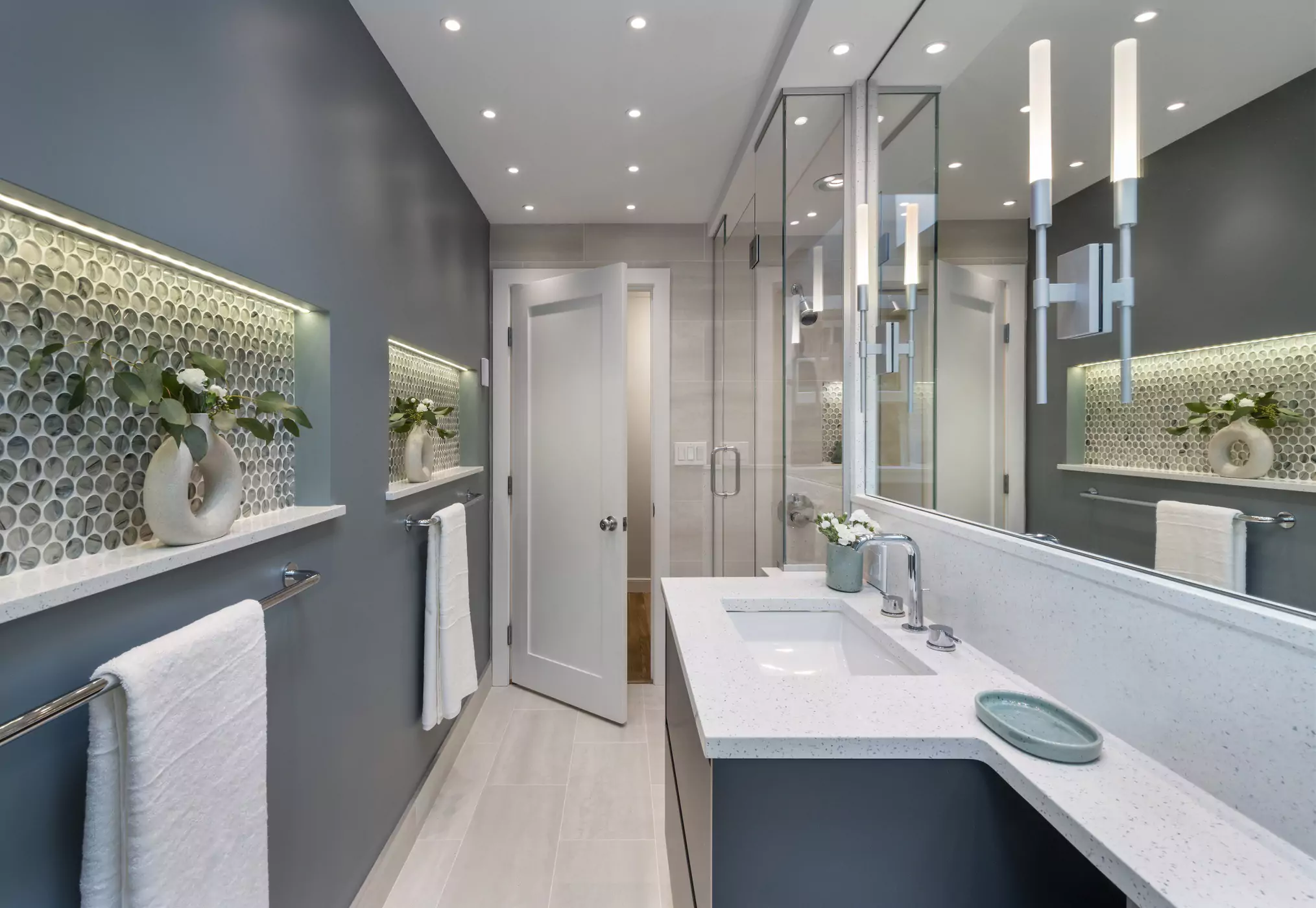 Subway tiles, chrome fixtures, and elegant vanities for a style that will never go out of fashion.